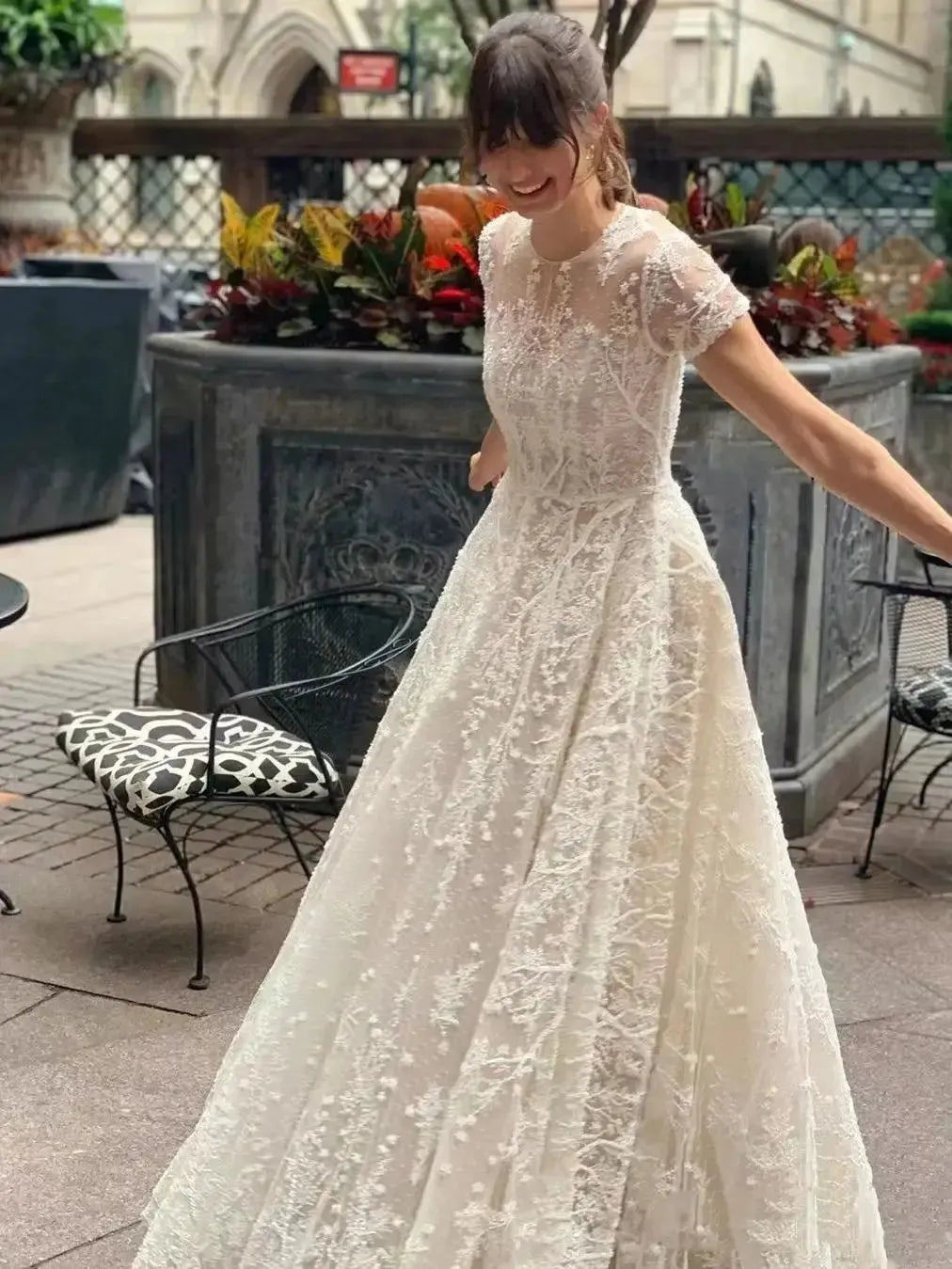بوهيميا فساتين زفاف عتيقة رقبة دائرية وأكمام قصيرة زي العرائس دانتيل زينة على شكل حرف a رداء طول الأرض Vestidos De Novia