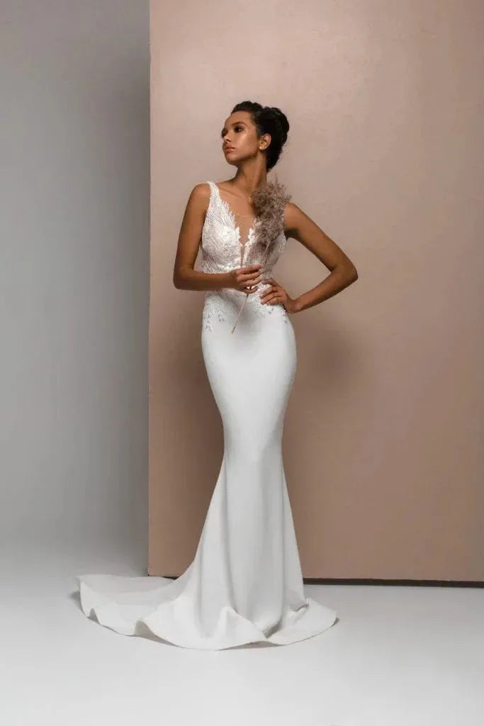 Sophisticated Mermaid Wedding Gown with Straps, Illusion Neckline, and Lace Embellishments for a Chic Bridal Look