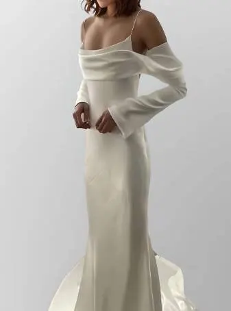 Weiße Meerjungfrau Brautkleider formelle Langarmabendkleid Boho Strand von der Schulter anpassen, um elegant zu messen