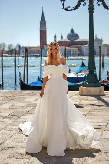 Vestido de novia de crepé con hombros descubiertos, pliegues y lazo, corte en A, largo hasta el suelo, con espalda recortada