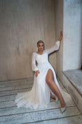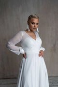 Vestido de novia de gasa de talla grande, cuello en V, manga larga, abertura larga, vestido de novia blanco de playa, cola de barrido, vestido sencillo personalizado