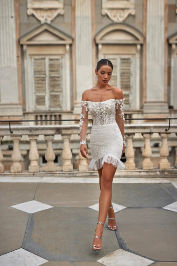 Vestido de novia corto con hombros descubiertos, mangas largas y falda desmontable en forma de A con cola. Vestido de novia estilo sirena, princesa, cola de corte, satén, moderno, mangas blancas.