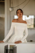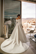 Vestido de novia sencillo de satén, personalizado, elegante, cuello barco, largo, sin mangas, con botones y cola de corte.
