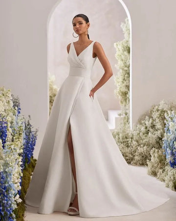 V-neckline, V-back and Straps Wedding Dress Vestido De Novia Bridal Gown Princess Satin Court Train Bow Sleeveless Mermaid