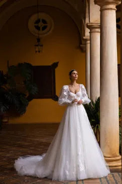 A-Line Elegant Wedding Dresses Sweetheart Long Puff Sleeves Appliques Brides Gowns Sweep Train Bridals Party Dresses