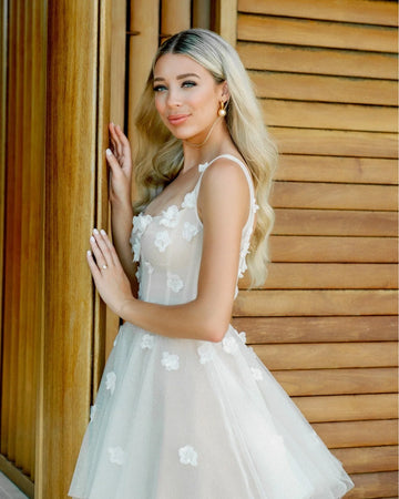 A-Line Short Wedding Dresses 3D Bunga Lengan Tulle Brides Gaun Pesta untuk Wanita Gaun Koktail Vestidos Novias Boda