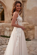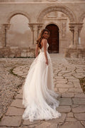 Gaun Pengantin A-Line Elegan Wanita Lace V-Neck Terbuka Kembali Tali Spaghetti Tulle Gaun Pengantin Gaun Pengantin Kereta Vestidos de Noiva