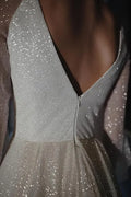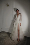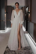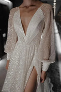 Gaun Pengantin Glitter Deep v Neck Sexy Lengan Panjang Berpisah garis terbuka gaun pengantin yang mengkilap vestidos de novia jubah de mariee