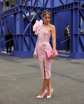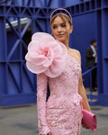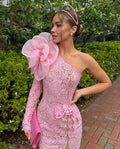 Modest Pink Lace One Shoulder Prom Dresses with 3D Big Flower Slit Tea Length Women Formal Party Dress Wedding Guest Gowns Pink