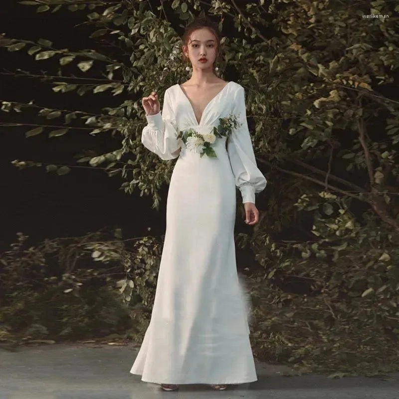 Pengantin gaun pengantin putih wanita seksi deep v neck leher jejak gaun lengan panjang gaun pesta malam tamu elegan