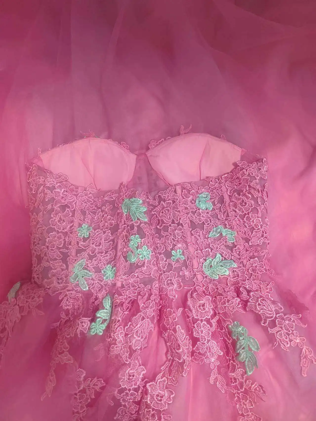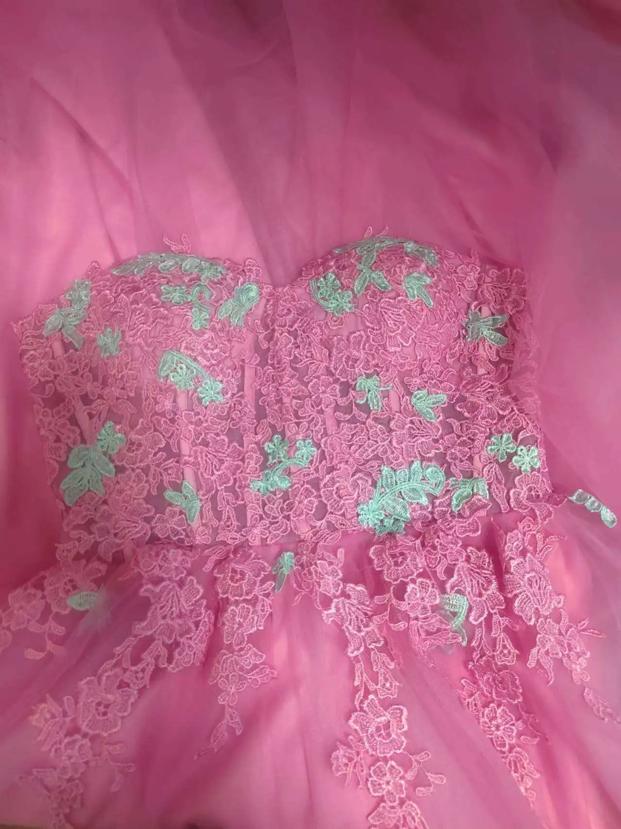 Pink Lace Appliques Tulle Prom Dresses Strapless A-line vestidos de noche Elegant Sleeveless Side Split Formal Evening