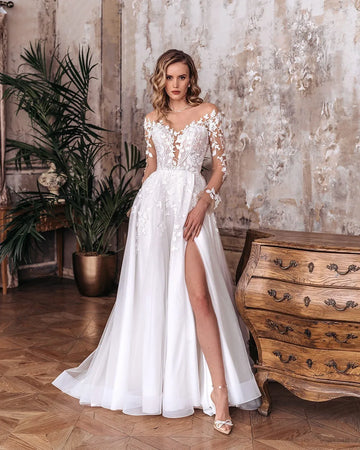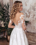 Elegant A-Line Wedding Dress Women Open Back V-Neck Lace Long Sleeve Side Split Tulle Bridal Gown Sweep Train Vestidos De Noiva