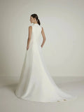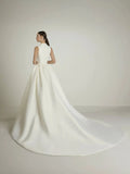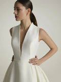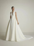 A-Line Sleeveless Wedding Dress with V Neck with with V Neck in Pique White Mermaid Satin Modern Princess Vestido De Novia Bow Satin Court Train Sleeves Bridal Gowns Satin
