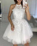 Halter Short Prom Dresses Lace Applique Backless Formal Party Pink Blue Ball Gown Champagne Evening Gown Custom made
