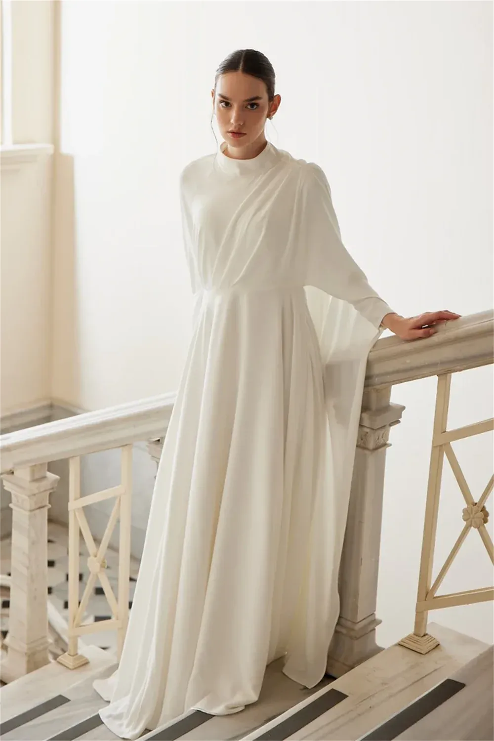 Muslim Wedding Dress | Muslim White Prom Dresses Chiffon A-line فساتين السهرة Graceful Undetachable Shawl High Crew Neck vestidos de fiesta