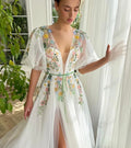 Off White Prom Dresses Lace Embroidery A-line فساتين السهرة V Neck Sweet Puffy Sleeves Side Split Vestidos De Noche