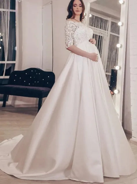 Pregnant Wedding Dress Plus Size Off Shoulder Half Sleeves Satin Lace Pearls Crystal A Line Bridal Gown Women Elegant Bride Ivory